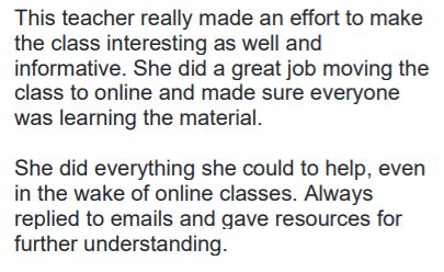 I get my reviews back each semester and am always really astonished because initially I was so nervous to be in charge of a classroom. I did it for my degree, but now I know its something I can do well. I am proud of myself, but of course I can always improve. I will showoff my feedback since 2019 though. When students went to review the director’s name: Johnson, was listed, not mine – but these are from my official scores. It’s funny – they address me as Mrs. and Ms. but at the time I was Ms. Ploderer. Now I’m Mrs. Rostig and of course I still get Ms. Ploderer’s in emails. I like it when they call me professor but I’m not one and I remind them, I’m just an instructor. All in all, it’s been an awesome experience.