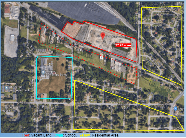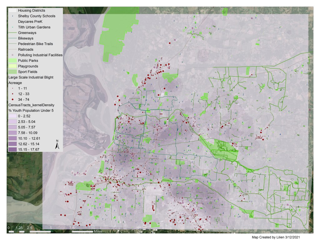 This is a map I made using data from the University of Memphis and ReGIS to assess school proximity to blight. I’ve been able to analyze these maps to figure out which schools have blight (residential, commercial or industrial) within 0.5 mile (walking distance) from their campus. The dark red dots represent large scale (1+ acre) industrial blight sites, I located by using parcel data which has Zoning codes that can be isolated in queries on ArcMaps.
