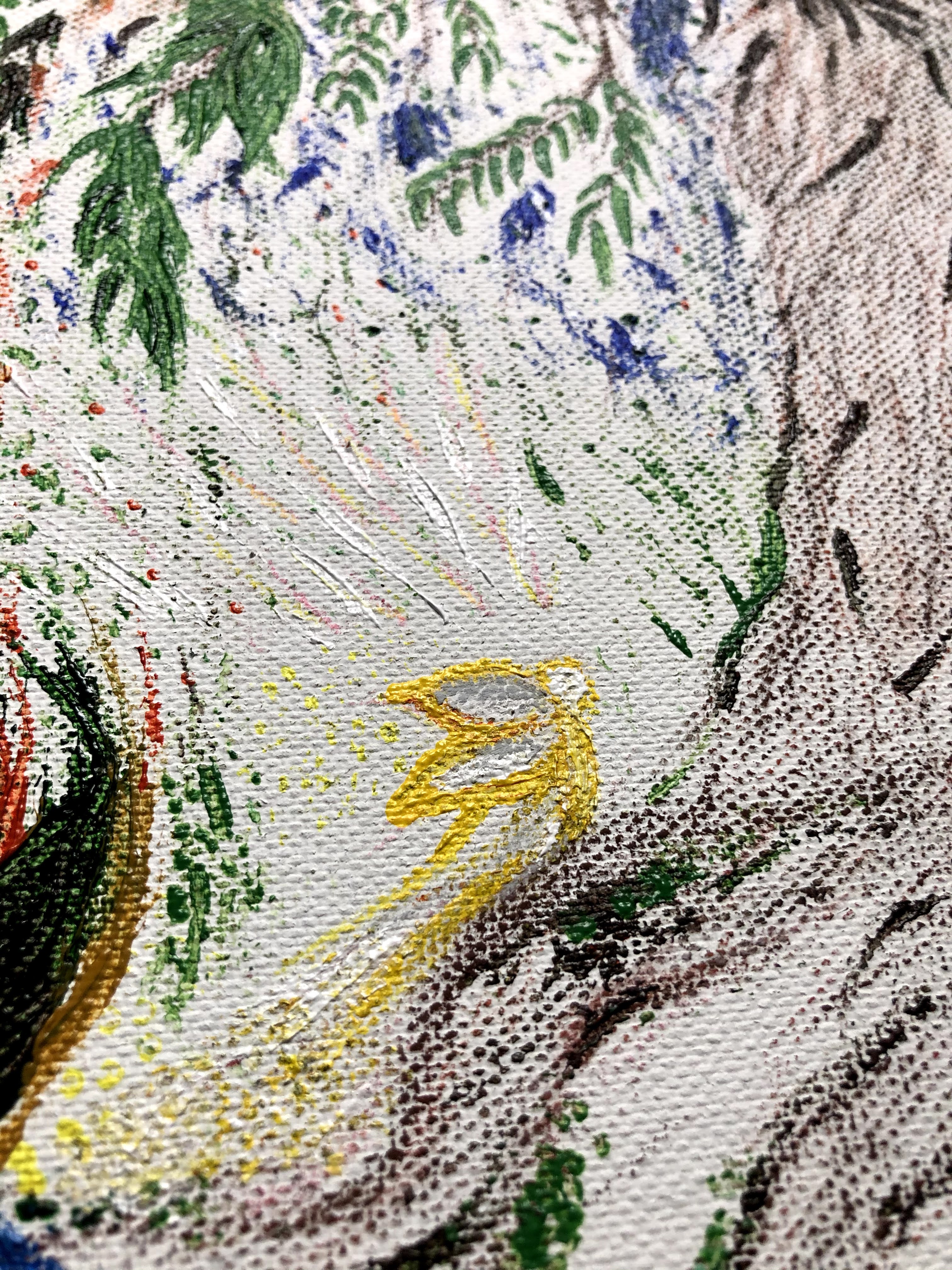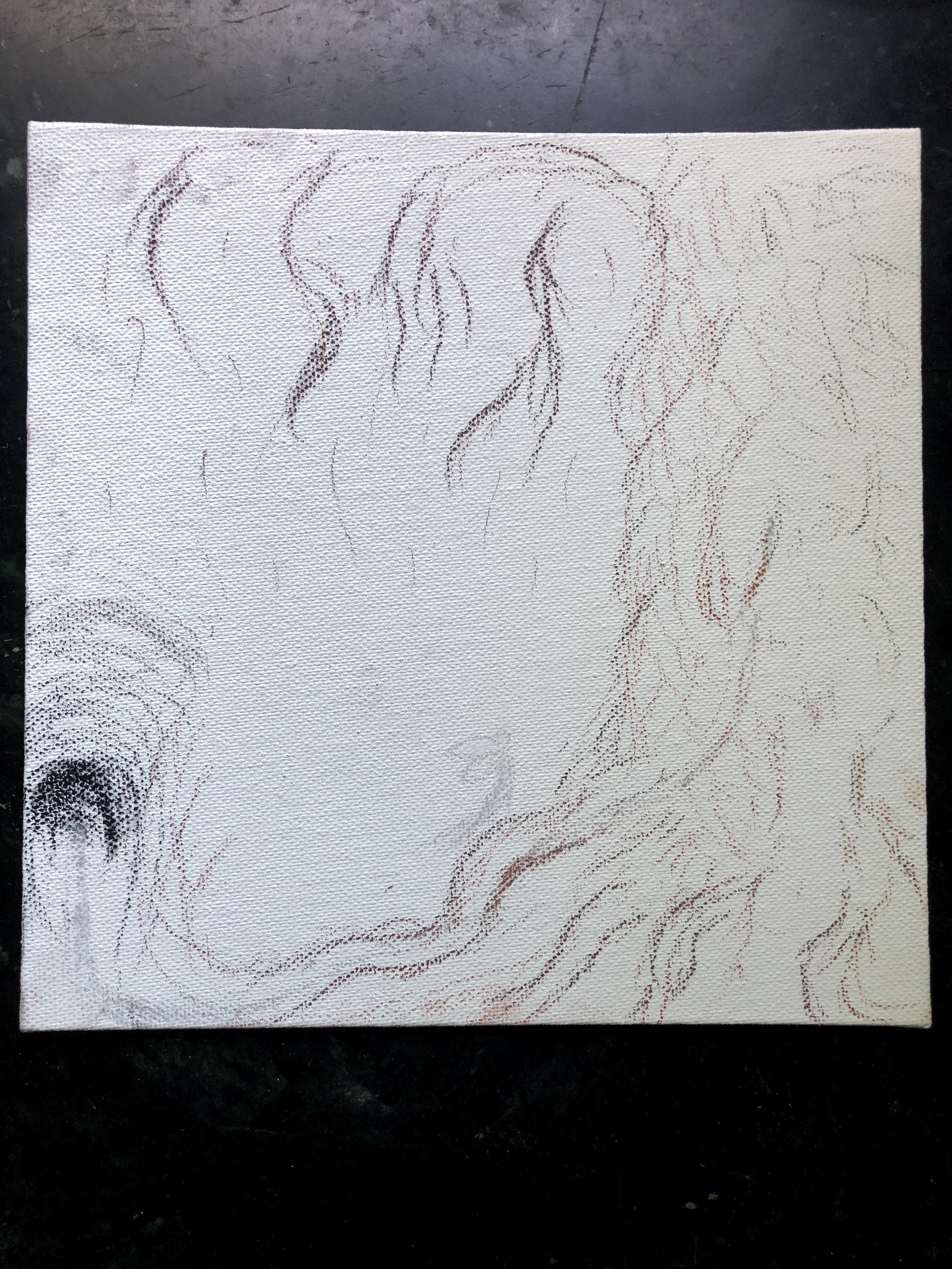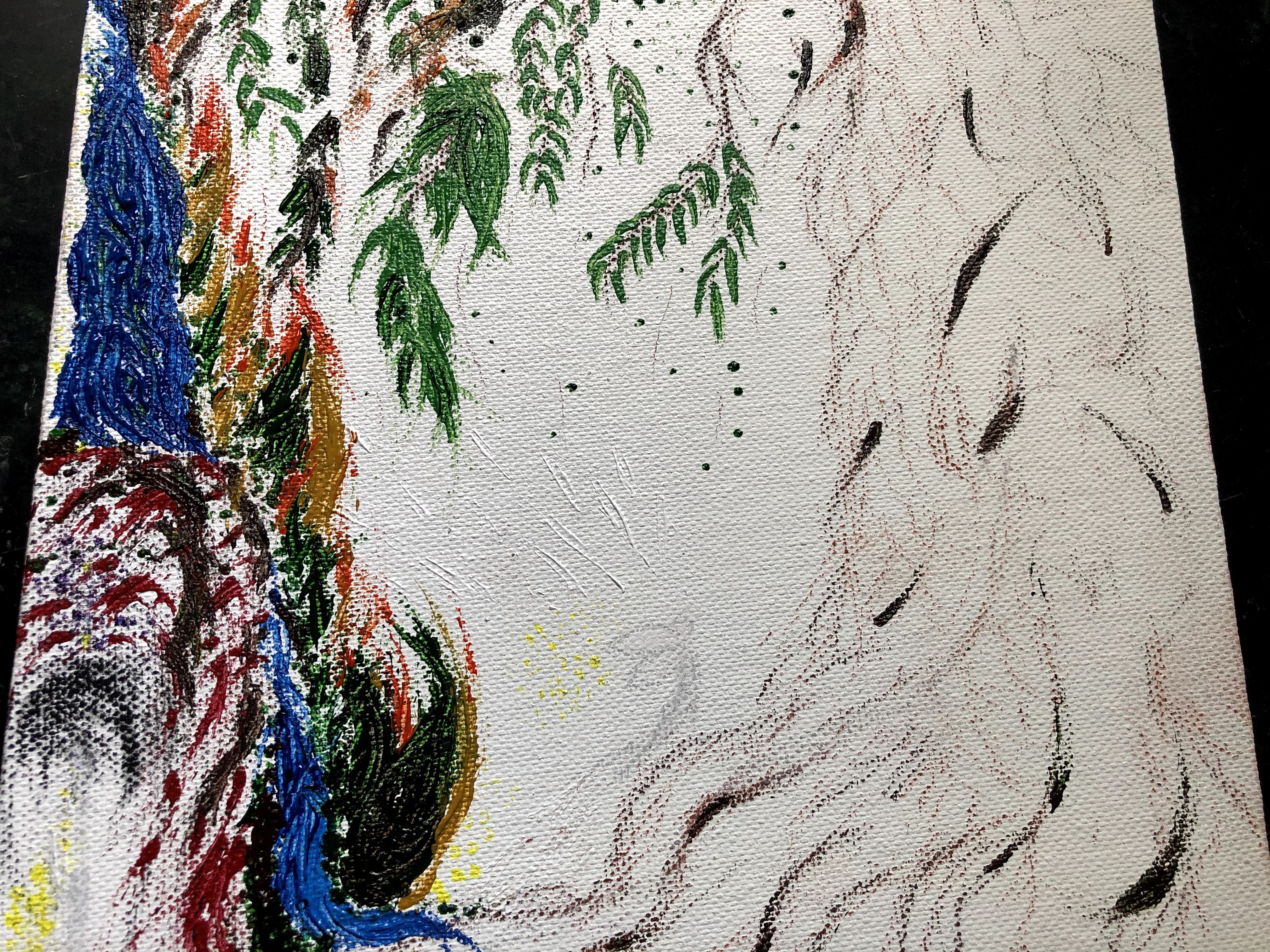 I started drawing the roots to a tree, then imagined a fairy going through a tunnel in the roots. Once I started painting, it began to turn into a fire burning and spreading up stream, embers sparking the branches of the tree – the fairy looks towards the hole in the tree, a safe haven within the mossy trunk.