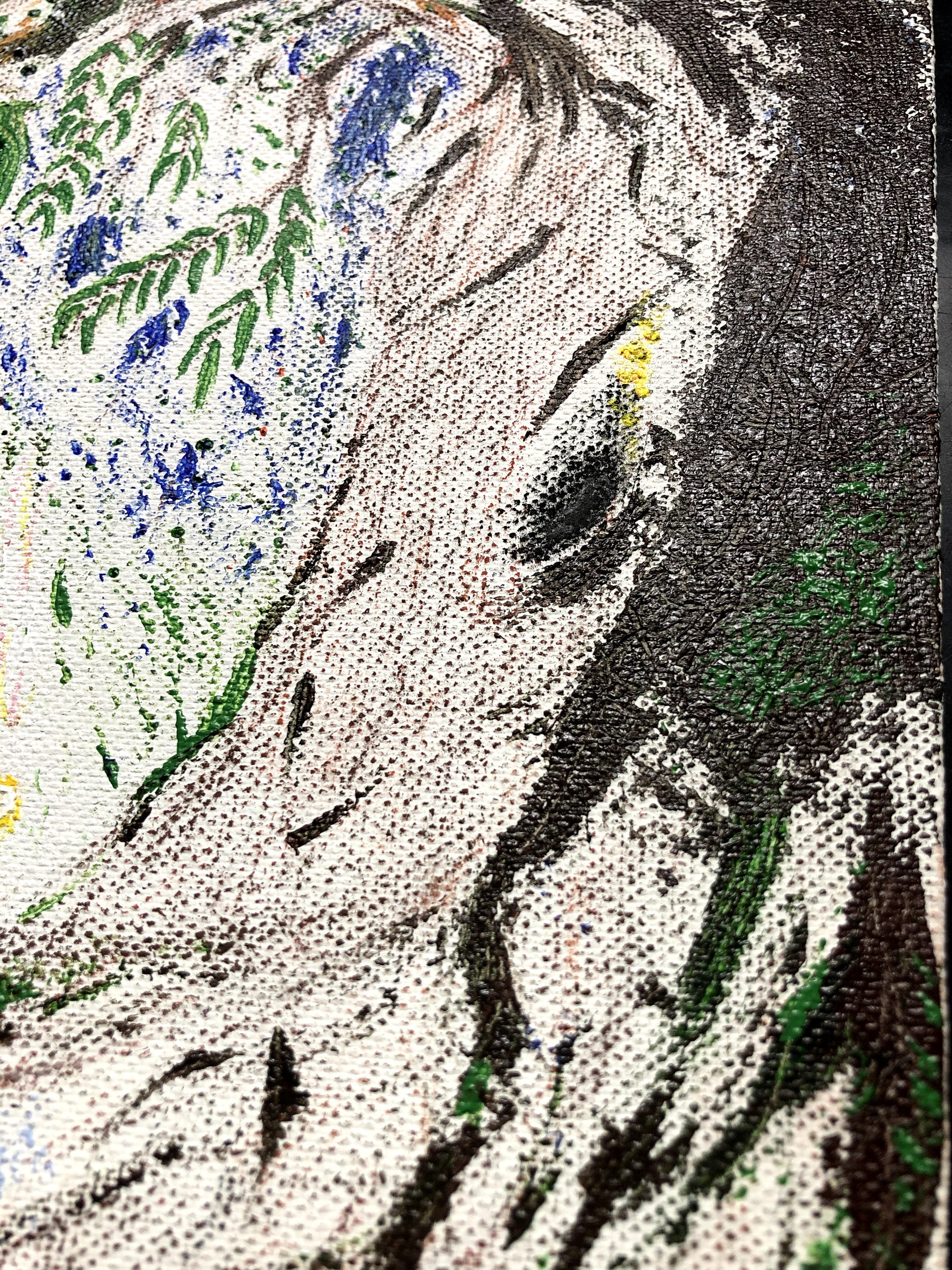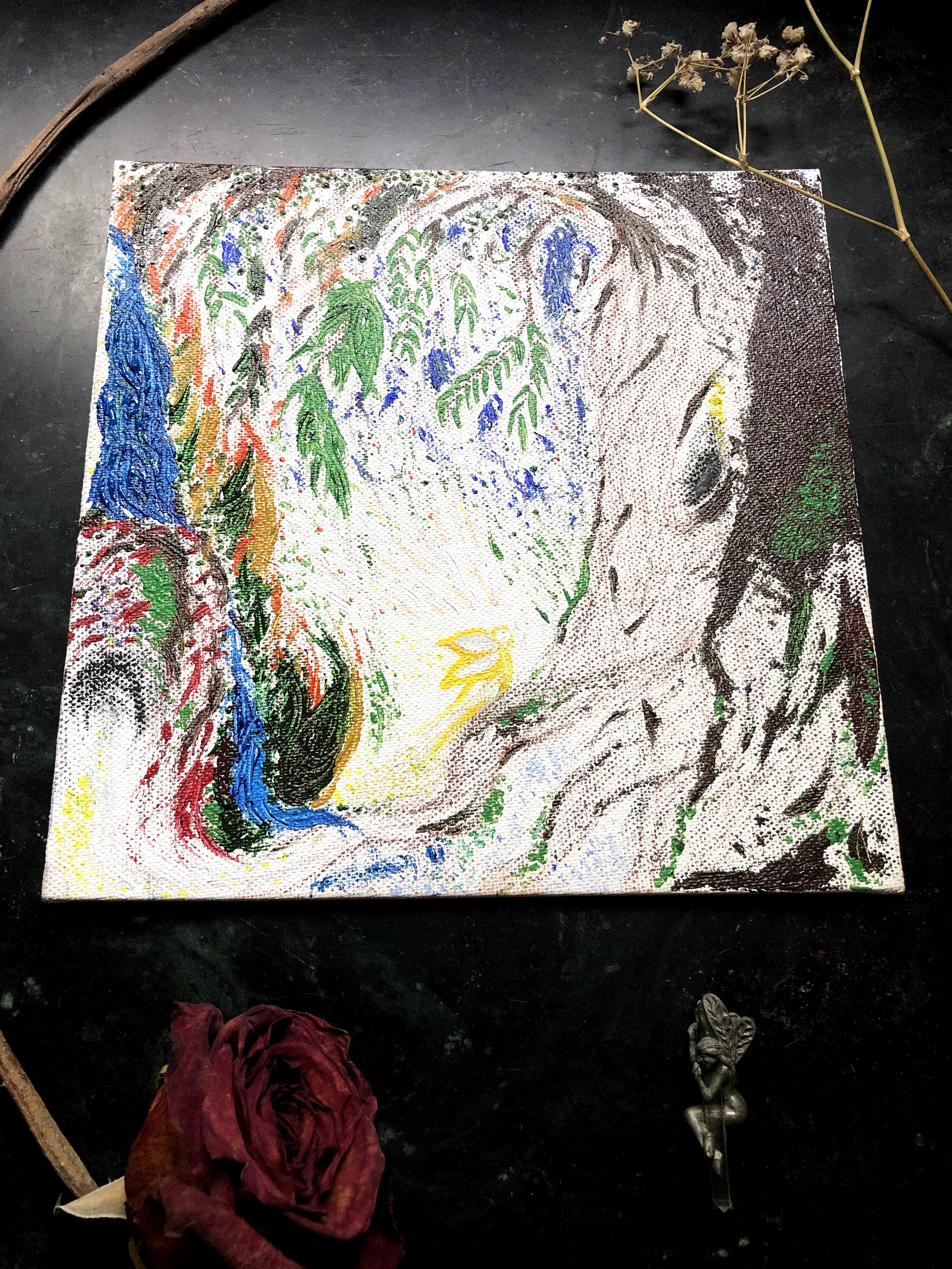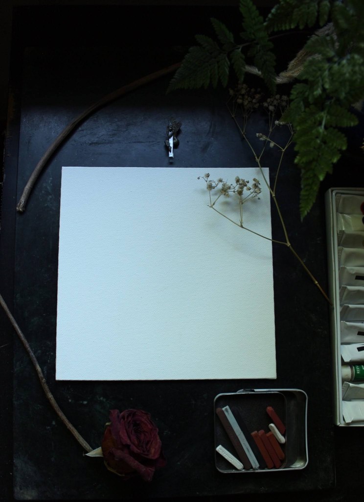 Two days ago, I set up a table for a canvas beneath an open window looking to the backyard, with an Elder tree branch and dried flowers I’ve had for months, next to my favorite Fern. The little fairy holding a crystal was given to me by my mom a long time ago, which I keep nearby always and love very much.