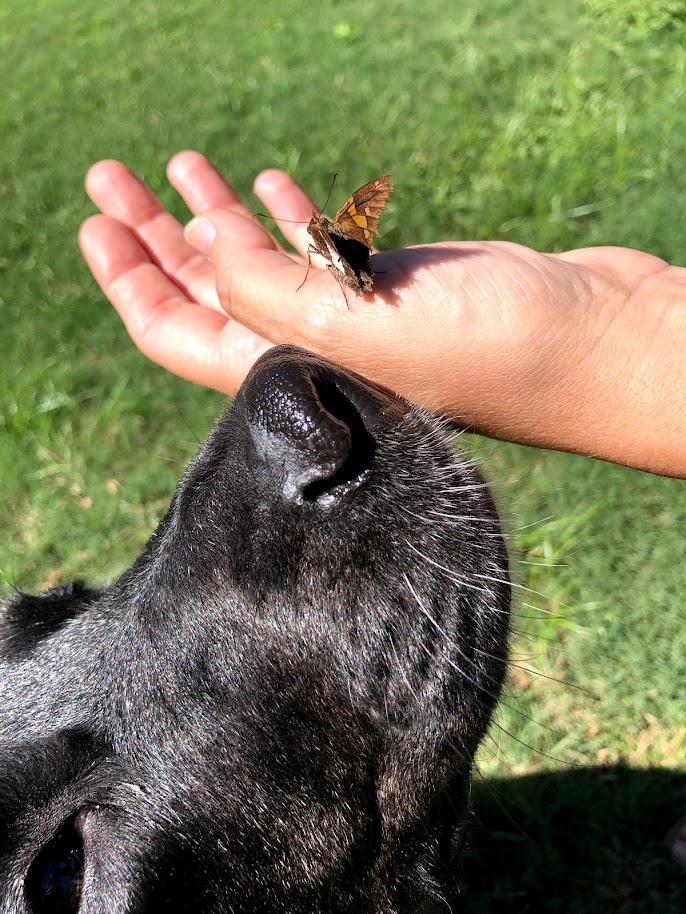 Lots of activity lately – backyard foraging, more vineyard grape picking, this time Muscadines, visiting some horses, holding a little butterfly 🙂