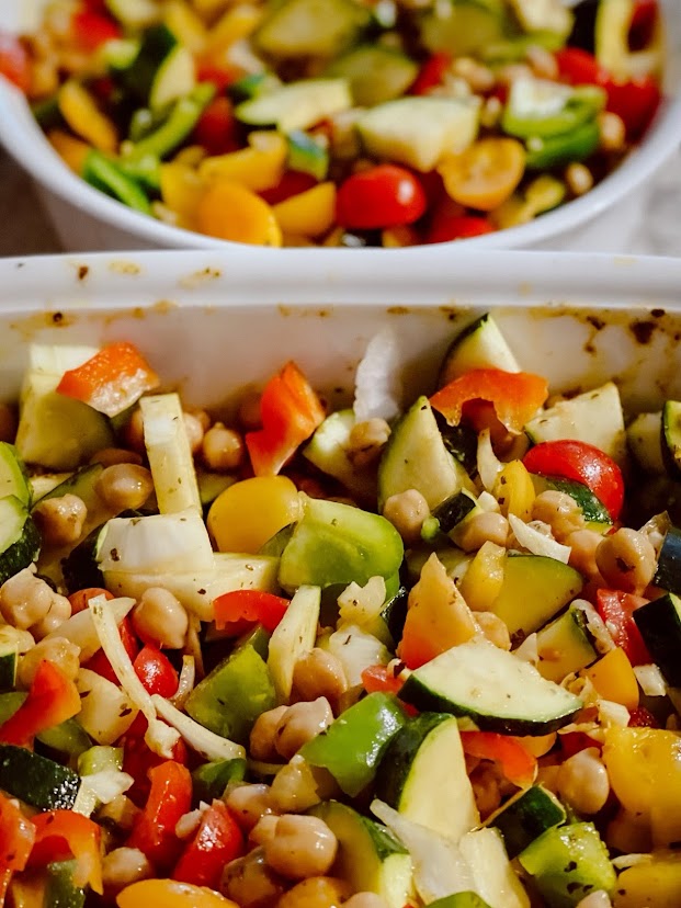 Open and strain cans of chickpeas and rinse them, then place them into your baking dish and mix well with spices