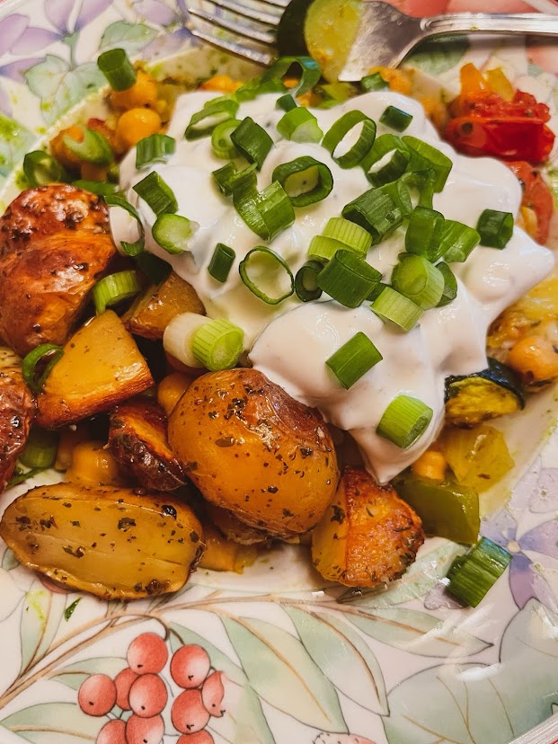 While chickpeas bake, check potatoes and remove if golden brown/cripsy, set them aside to cool