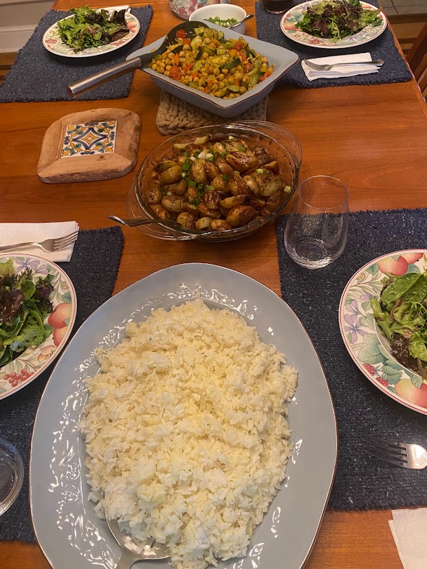 Once water is boiling, add 3 cups of rice, stir, reduce heat to low, cover with lid, stir occasionally, add some butter, parsley and oregano once done, let sit
