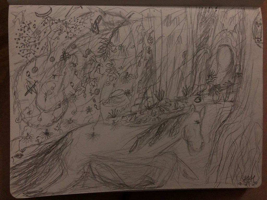 This drawing came to me randomly around 1am one night.. I had to get up and sit in bed with my sketchbook – I saw a horse running from a dragon towards a portal and the backdrop was a forest with wild flowers hanging from vines.