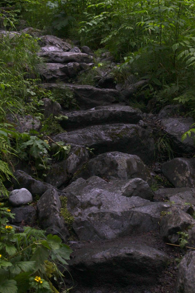 Out the door she went, just as a big gust of wind blew. But the cold air was refreshing and made her take off skipping with excitement. It had snowed a few weeks earlier, but now the ground was brown, and a few branches and plants were already beginning to bud. She looked down and saw a lone violet, the first flower she had seen all season. Bending down to look closely, she smiled and then kept going. As she walked, she passed the field and garden of her home, and went into the tall grasses towards the creek. She followed the creek until it brought her to the forest edge. Looking around, she could see the mountains and her home getting smaller. She paused and thought how long it would take to reach the clearing – she could see it still, though the perspective was different now than from her bedroom window. The incline was not very steep, but the mountain was wide, and densely forested. Even though Elin was young, she knew about the four directions. Her father had taught her very early about the sun’s location in the sky, even the names of some stars, and the moon phases – this was common knowledge for most children in the village. Elin looked towards the sun and knew it had risen from the East, in the direction of her home. She had to go Northwest to reach the clearing, which was now the direction she faced. Looking up she started to see a line of white smoke rising and it made her eyes widen with curiosity. Pausing one more time to look back at her house and around at the trees, she made sure she was directly beneath the location of the clearing so she could walk as straight up as possible. To make sure she would be able to recognize the path back, she took a stone from the ground and made a marking in the bark of a pine, “this way I’ll know where to come back to if I go again,” she said to herself, and to the tree as she rubbed the stone to carve a line. As she tossed the stone back to the ground, she looked down and saw another stone with a shiny blue gleam. “What’s this?” she said aloud. Slowly walking towards it, the stone began to shimmer and glow brighter. The wind began blowing again as Elin got closer with her basket, ready to add the strange stone to her collection.